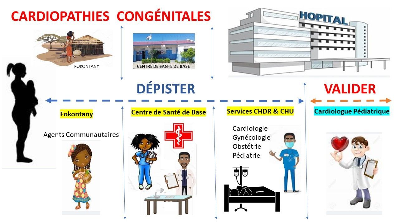 L'observation de la pyramide des soins permet de préciser les acteurs susceptibles d'effectuer le dépistage d'une Cardiopathie Congénitale.